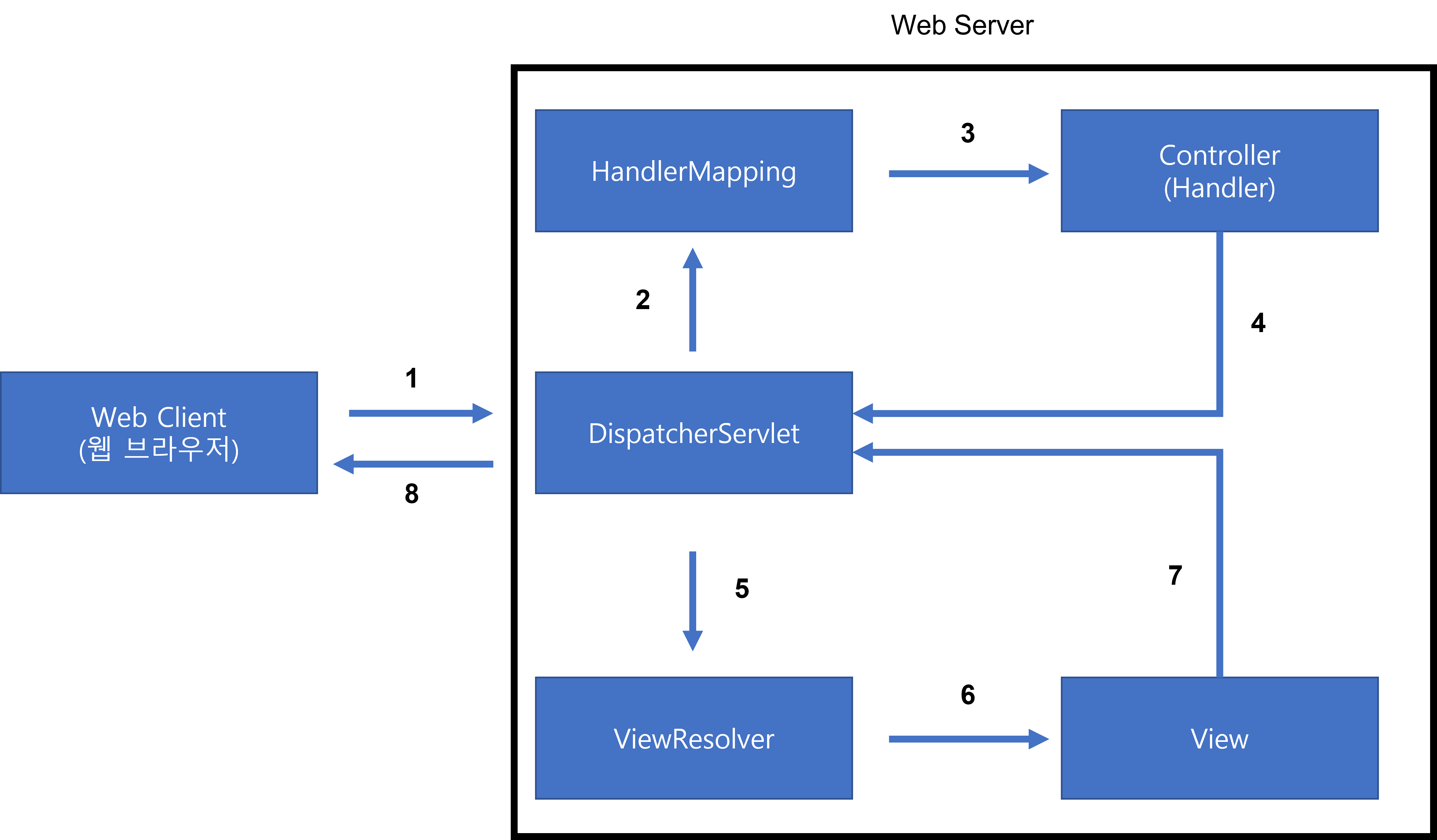 스프링 프레임워크에서는 웹 애플리케이션 개발을 위한 Web MVC 프레임워크를 제공한다. 웹 MVC가 동작하는 순서와 구조는 위의 도표와 같다.