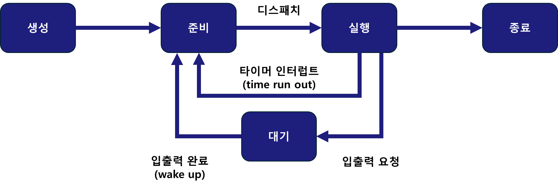 프로세스는 생성(new), 준비(ready), 실행(running), 대기(blocked), 종료(terminated)의 상태 중 하나의 상태를 가지며, 이 상태는 PCB에 기록된다. 생성 상태는 프로세스가 생성 중인 상태이며 아직 실행 준비를 마치지 않은 상태이고, 준비 상태는 실행 준비를 마치고 CPU 할당을 대기하고 있는 상태이다. 이때, 프로세스가 CPU를 할당받아 실행 상태로 변하는 것을 '디스패치'라고 한다. 프로세스가 CPU를 할당받아 실행 중일 때 실행 상태가 되며, I/O작업 등이 발생했을 때 대기 상태가 된다. 프로세스가 모든 작업을 마치고 종료되면 종료 상태가 된다.